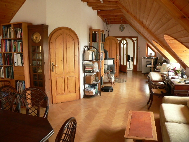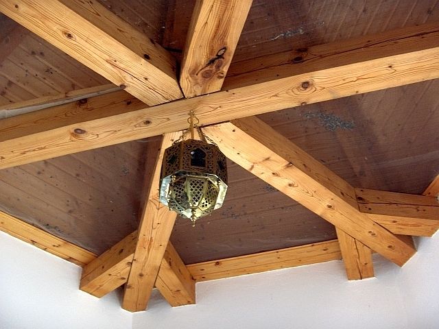 Oberes Bild: In der Mitte vom Bild ist die Tür zum Schlafzimmer. Unteres Bild: Dachstuhl des sechseckigen Turms. Überall in der Johannesburg finden Sie liebevoll gefertigte Details.