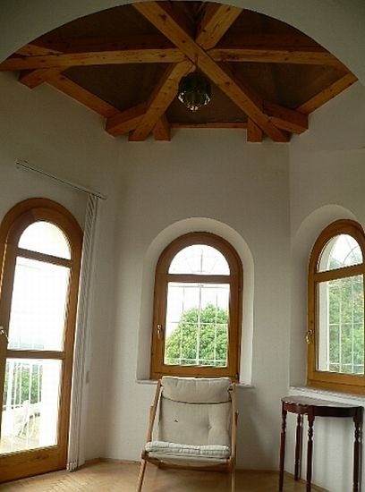 Hier ist der linke sechseckige Turm der Johannesburg zu sehen. Im rechten runden Turm befindet sich das Treppenhaus. Links im Bild ist die Tür zum Balkon.