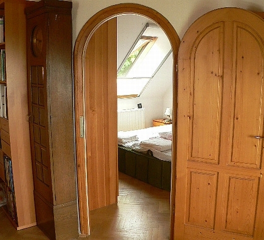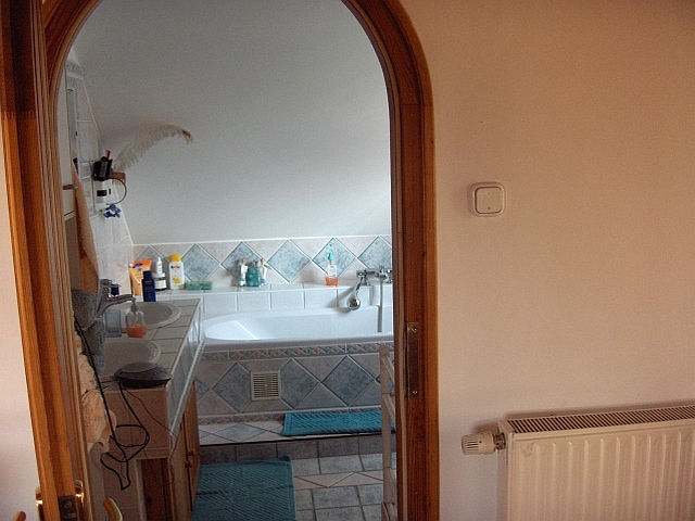 Oberes Bild: Blick in das Schlafzimmer. Das Fenster zeigt zum Weinberg. Unteres Bild: Blick ins Badezimmer