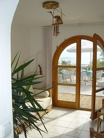 Über die Tür kommen Sie direkt zur Terrasse. Die Terrasse der unteren Ebene ist erfahrungsgemäß der beliebteste Treffpunkt der Bewohner.