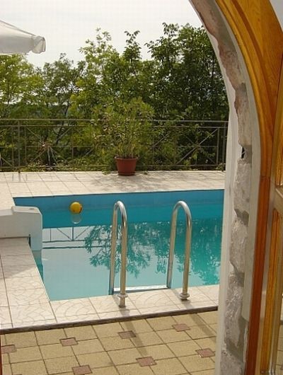 Mit nur fünf Schritten sind Sie im kühlen Nass. Links im Bild sehen Sie am Rand vom Schwimmbecken eine Gegenstromanlage. Damit können Sie einen Wasserstrahl erzeugen und quasi auf der Stelle schwimmen.