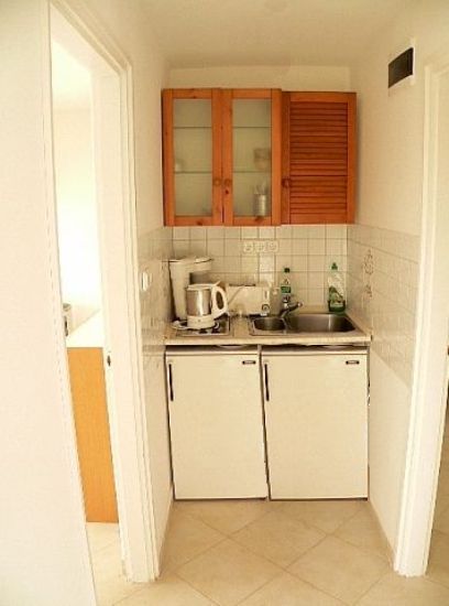 Raffiniert wurde die Mauernische als kompakte Küche mit Herd, Kühlschrank und Spühle genutzt.