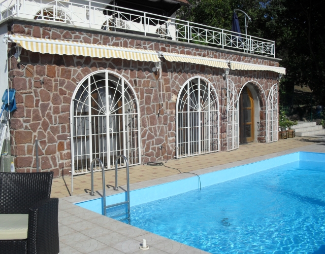 untere Etage: Die Eingänge zu den drei kleinen Appartements sowie der Pool.